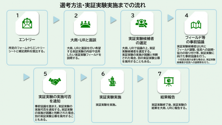 申請案件については、内容や要件等の確認など所定のプロセスを経て、実証実験の実施候補を選定の上、案件には、実施に向けた実証場所の協議・調整をはじめ、広報・プロモーション等のビジネス化の支援などを行います。