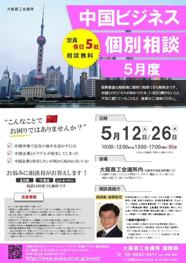 <5/12,5/26開催>中国ビジネス無料個別相談(5月度)