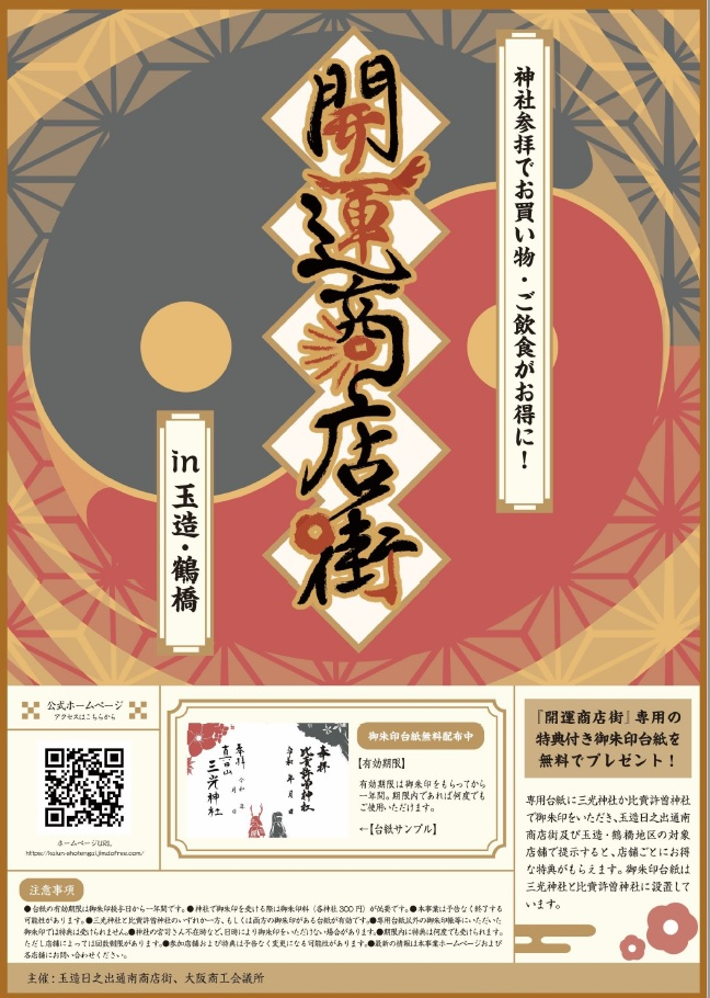 専用御朱印台紙に三光神社(天王寺区)か比賣許曽神社(東成区)の御朱印をいただき、玉造日之出通南商店街および玉造・鶴橋地区の対象店舗で提示すると、店舗ごとに異なるお得な特典がもらえるイベントです!